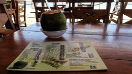 Aqua de Coco - bem gelada, dazu Camarao grelhado com alho e olho