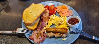 Also Spiegeleier, Rühreier (pochiert gibt's nicht, hatte ich mal gefragt) und dazu frischen Speck angelassen.