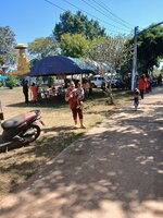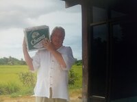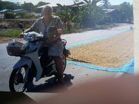 Ich liebe den Isaan - gestern war Reisernte und heute verteilen und ausbreiten des Reises ( verbotenerweise 555 ) auf blauen Netzen auf der Straße. Und immer wieder mit dem Holzrechen tagsüber durchrechen und dabei wendet sich der Reis. Ist zum Trocknen. Morgen noch einmal, dann in Säcke und in das "Reishäuschen verfrachten. Meine Arme sind jetzt schon länger als bei nem Orang Utan. 555