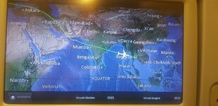 Abu Dhabi - China ist diese Woche auch wieder mit „örtlicher Umleitung - Umfahren Sie das Gebiet weiträumig“ geflogen worden, also südlich dran vorbei. Man hätte fast über Nordthailand mit dem Fallschirm abspringen können. Trotzdem dadurch keine Flugzeitverlängerung.